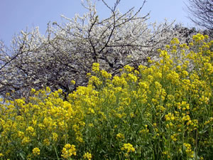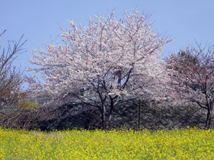 山北駅の真正面には、菜の花畑が一望できます。ここはかなりの急斜面で、桜の後ろは東名高速下り線のフェンスです。 |