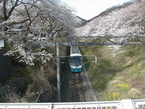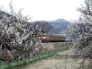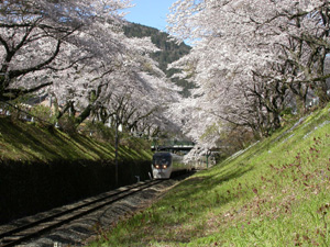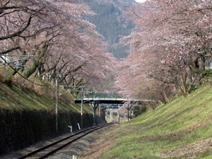 山北町の桜 東海道線ができるまでここは川でした。この200mm手前の山を掘り割って酒匂川に流しました。ですから地名は掘割、右側は複線だった頃の跡です。D51が走っていた頃は柱もなく、ロングショットで綺麗な桜が見られました。 |