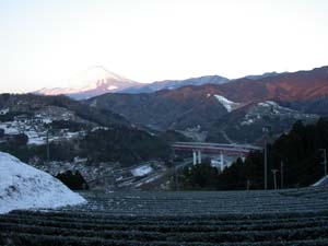 お茶畑からの富士山です。 1月7日は雪でした。翌日は、まだ根雪が残っており左の写真同様に暗い時間の撮影です。撮影している場所はちょうど東名高速都夫良野トンネルの真上あたりです。 |