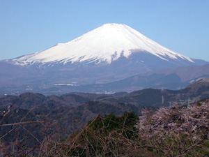 | アサヒのビール工場から足柄峠の近くにある櫓岳を見たところです。工場の中の桜はもう少し成長したら素晴らしいお花見ポイントになるとお思います。 | 高松山から撮影した富士山です。写真より下の部分には山桜が満開なのですが、ここからでは見え無いのが残念です。 |