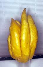 | 仏手柑 仏の手の蜜柑と書いて仏手柑と言うそうです。患者さんが持ってきてくれました。ネーブルや温州蜜柑の原種には裏側に臍のような分かれ目があります。おそらく柑橘類のもっと原種はそれが房ごとに別れていたのではないでしょうか。 |