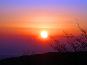 日の出 初日の出ではありませんが、足柄峠から見た日の出です。晴れた日には国府津、相模湾、江ノ島、房総半島まで見えます。新潟の先生から水平線から昇る初日の出が見たいといわれたことがありますが、足柄では高い山に登ぼれば昇るほど房総半島が見えてしまうので、熱海の海岸をお薦めしました。 |