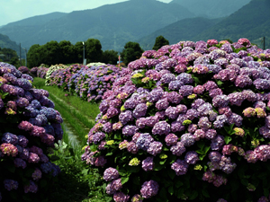 | 紫陽花農道 診療所の川向こうには、田圃の畦一面に紫陽花が植えてあります。ここだけは雨の日がおすすめです。 |